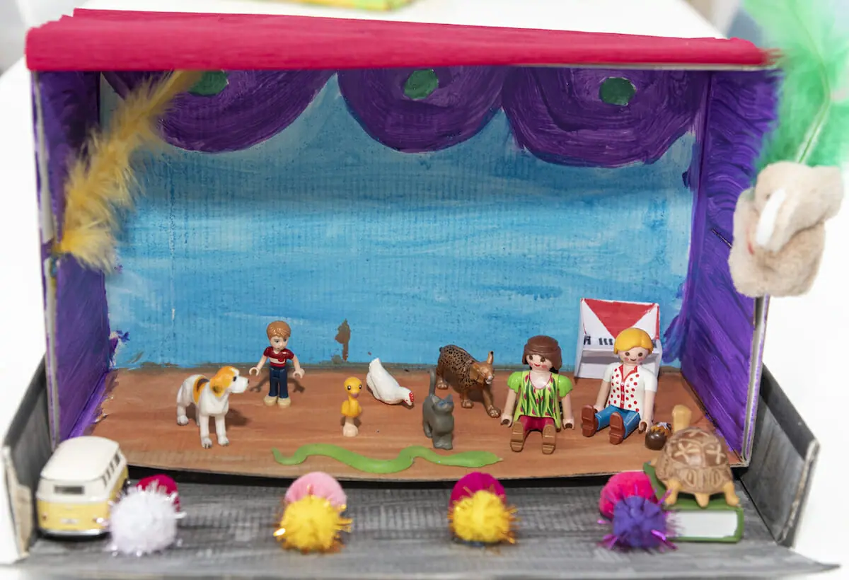 Nichtsdestotrotz gab es auch eine Langzeit-Hausaufgabe: Parallel zu der Buchpräsentation gestaltete jeder Schüler eine Lesekiste zu seinem Buch. Darin wird eine Szene, eine lustige Situation aus einem beliebigen Kapitel dargestellt oder die Protagonisten können vorgestellt werden. Die Kinder waren mit Eifer und Fleiß bei der Sache und es entstanden wunderschöne, kreative Mini-Erzählungen zum Roman.